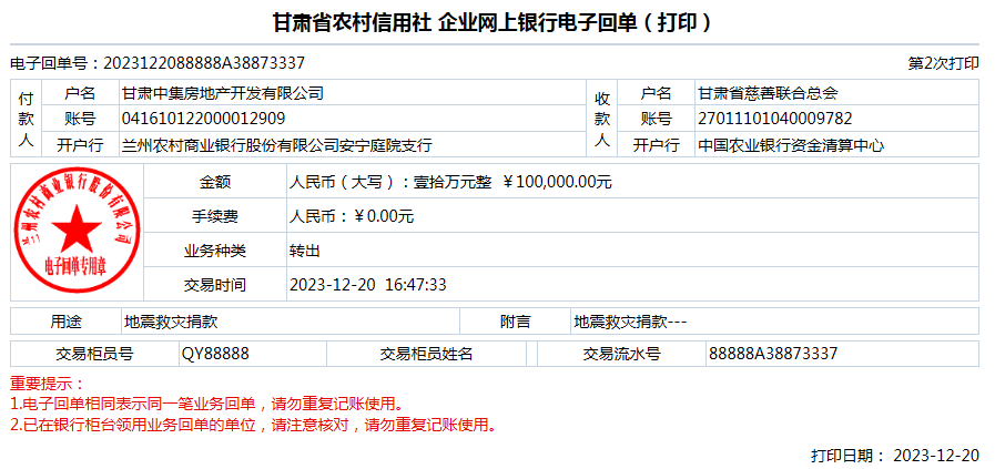 一方有難,八方支援,獲知積石山縣受災(zāi)情況,甘肅中集集團(tuán)第一時(shí)間緊急響應(yīng)、迅速?zèng)Q策,通過(guò)甘肅省慈善聯(lián)合總會(huì)為積石山地震災(zāi)區(qū)捐款10萬(wàn)元,用于積石山縣災(zāi)區(qū)緊急救援和受災(zāi)困難群眾生活保障。